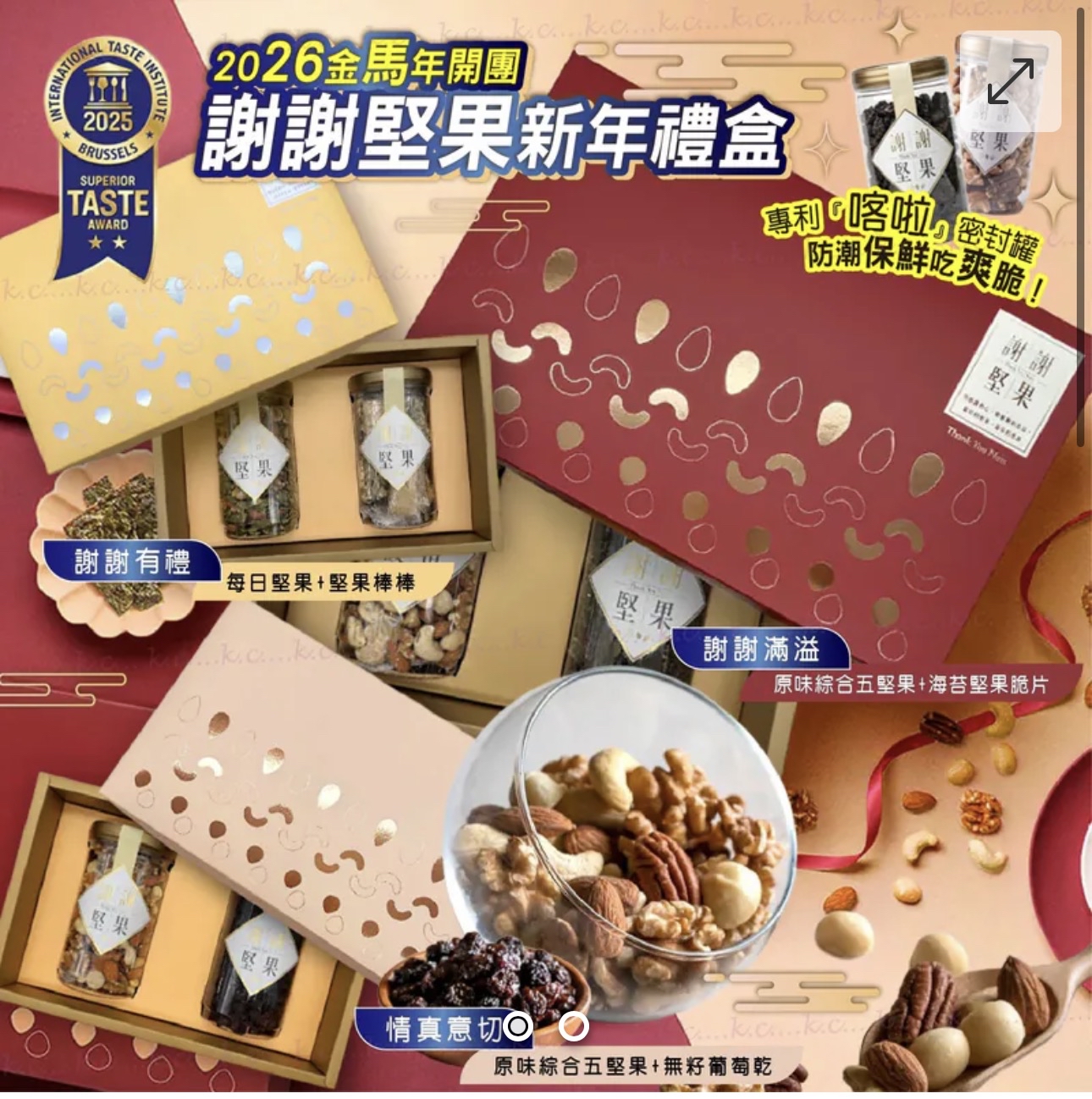 台灣頂級謝謝堅果新年禮盒 ✨春節送禮首選|感謝滿溢,新年心意最到位🧧🧧 用滿滿的天然堅果香氣,把你的謝意❤️心意❤️年味一次裝好裝滿🈵 最特別的是—— 全系列使用專利 『喀啦』密封罐! 👉 0~60天,保持像剛烘好一樣的香脆新鮮,每天打開都聽到那聲「喀啦」,年味就從這裡開始🎉 A|情真意切組 真心要送的人,用料不能含糊。 ✔︎原味綜合五堅果 334g ✔︎無籽葡萄乾 386g 銷售第一的無調味綜合堅果人氣王,一次補充多種堅果營養素。 無籽葡萄乾天然無添加糖,顆顆Q軟飽滿保留天然的甜味與營養,抓一把隨時補充你所需的營養。 --- B|謝謝有禮組 想簡單有禮,選這款最剛好! ✔︎每日堅果 334g ✔︎堅果棒棒 188g 一日一堅果,健康常保有。抓一把,滿滿營養元氣補充一次到位。 嚴選優質堅果~將南瓜子/杏仁片/腰果翻炒至熟後,引出濃郁香氣,混入精選白芝麻,再淋上甜而不膩的精質麥芽,堅果清香紮實飽滿,口感酥脆不黏牙,為品茗必備小品! --- C|謝謝滿溢組 最熱鬧、最豐富的一組! ✔︎原味綜合五堅果 334g ✔︎海苔堅果脆片 165g 銷售第一的無調味綜合堅果人氣王,一次補充多種堅果營養素。 極選鮮脆海苔,低溫慢烘;少了油炸,低了鹽鈉,沒有防腐劑。 一開吃就停不下來,過年全家坐在一起最需要這味! ✨✨✨✨ 台灣頂級謝謝堅果新年禮盒 A.情真意切 💰 $238/盒 (原味綜合五堅果+無籽葡萄乾) B.謝謝有禮 💰 $238/盒 (每日堅果+堅果棒棒) C.謝謝滿溢 💰 $248/盒 (原味綜合五堅果+海苔堅果脆片) 📌三款禮盒,任選2盒或以上,每盒-$10📌 -產地:台灣 -禮盒尺寸:32.4×20.6×9.2 公分 -規格:A情真意切 1170克 (+-5%)/B.謝謝有禮 879克 (+-5%)/C.謝謝滿溢899克 (+-5%) -保存期限:生產日起計180天(商品銷售速度快,依實際出廠為主。) -保存方式:避免陽光直射,請置於陰涼乾燥。 -過敏原資訊: ※本產品含麩質之穀物、牛奶、蛋、大豆及其製品,不適合其過敏體質食用。 ※本產品與其它含有魚類、亞硫酸鹽、芒果、堅果與芝麻種子的產品於同一工廠生產,食物過敏者請留意。 ⭕️ 顏色或因拍攝器材或顯示螢幕等因素而與實物有異,以上圖片及文字僅供參考,一切以實物為準 ⭕️ 以上資料及外盒包裝只供參考,商品外盒原廠有更換新包裝權利,一切以實物為準。 ==⚠️ 聲明 ⚠️== 1.本貨品為平行進口貨。 2.所有帖文內容只作分享及參考用途。為免混淆視聽,所有商標或版權均屬有關商品品牌商標的持有人,敬請留意。 3.空運/海運有可能因各種不明因素影響而延誤到貨,成功訂購後,如非斷貨,不設退貨/換貨/退款,不接急單,如不能接受請勿下單。 4.貨品在運輸途中導致產品包裝外盒有任何損毀凹陷,但不影響其產品本身食用/使用,或有機會不預設外盒出貨,本司不會作任何更換或退款,介意慎購!